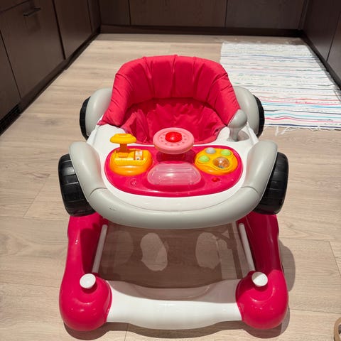 Hel og i orden, den har 4 svingbare hjul som gjør det lett og gøy å komme seg rundt mens man lærer å gå😊 den har også høyde justering så den kan vokse med barnet 😊 avtagbar leke, leken har lyd. Den kan legges sammen for smidig oppbevaring når den ikke er i bruk, vasket og klar for nye eier🤗