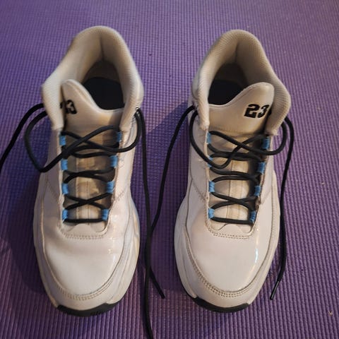 Nike Air basketballsko i størrelse 38. Skoene har en svart farge med røde detaljer, og er designet for dans, gir stabilitet rundt anklene. De er laget med slitesterkt materiale og har en komfortabel passform, ideelle for sport og fritid.