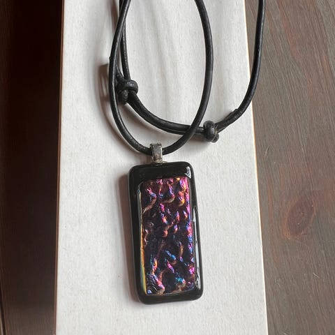 Halssmykke i metall med sorte lær-detaljer. Designet inkluderer hengende elementer som gir et unikt utseende.