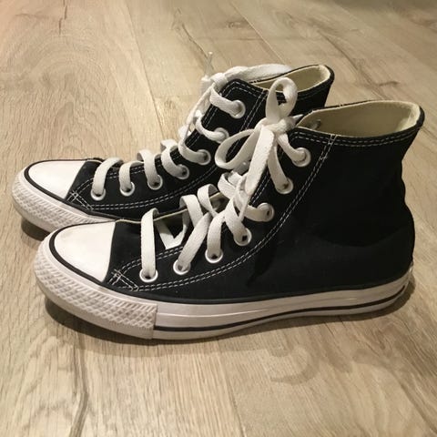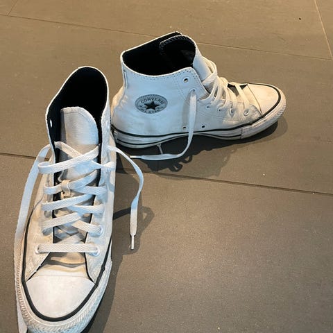 Hvite converse i størrelse 38. Slitt/hull i stoffet ved hælen, på innsiden av skoen, men selve skoene er solide, faste og i god stand.