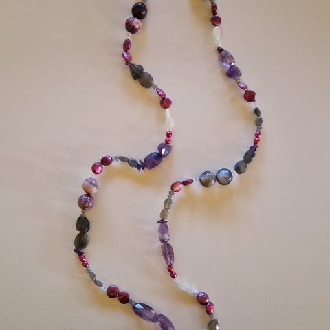 Laget med krystallstein av ekte Blondeagat, samt glassperler. Kjedet er ca. 40 cm. Smykket har dekorative perler i røde og klare nyanser, samt et sentralt anheng med ekte Blondeagat i smykkebur.