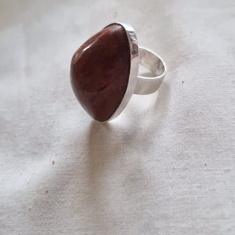 Krystallstein av ekte Karneol. Størrelse 56, men er utvidbar. Ringen har et enkelt design med en dekorativ rød stein som gir et elegant preg.