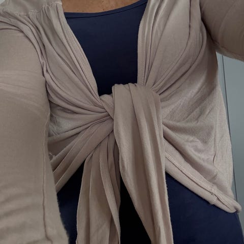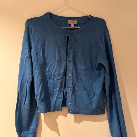 H&M cardigan for kvinner i størrelse S. Den er beige i fargen og laget av et mykt materiale, 50 % akryl og 50 % viskose, perfekt for hverdagsbruk eller som et ekstra lag på kjølige dager. Designet er enkelt og klassisk, noe som gjør den lett å kombinere med ulike antrekk. I størrelse small er den løs og ledig, kanskje litt oversized, så kan også passe til medium.