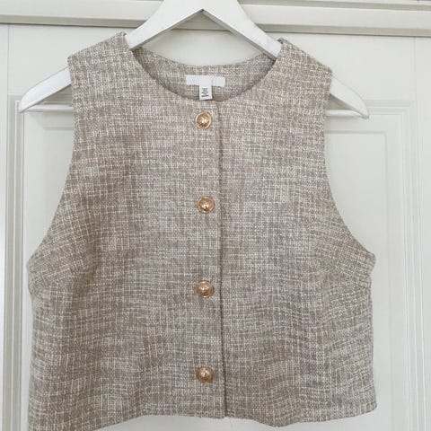 H&M Bluse i off white, størrelse 36. Denne blusen har et klassisk design med korte ermer og dekorative knapper på skulderen. Laget av et strukturert materiale som gir et elegant utseende. Passer perfekt til både hverdagsbruk og mer formelle anledninger.