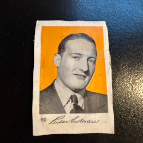 Meget sjeldent originalt samlebilde med autograf. Nummerert. Utgitt 1935. Se bilder for tilstand. Bildet er ex-album. Størrelse 6,7 cm x 4,5 cm. Typisk tidsmessig design fra 30-årene.