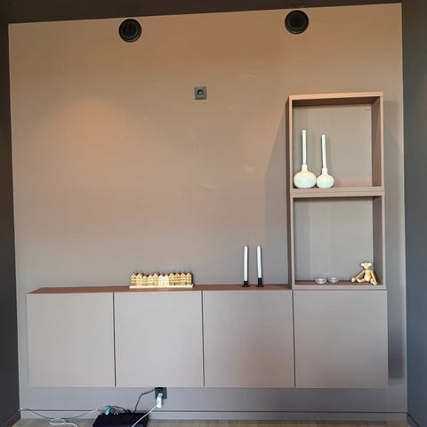 Stereoskap i grå farge med stoffdør. Dette er et svært stabilt hifiskap med 3 store og kraftige hyller for tunge hifi-komponenter. Det er et lite hakk i topplaten, som kan ses på et av bildene. Skapet er "grisetungt" og kan derfor ikke sendes, men må hentes i Skien. Siden jeg reiser en del mellom Skien og Lillehammer kan jeg ta det med å levere det på veien. E18 Oslo E6, eller via Hønefoss til Gjøvik