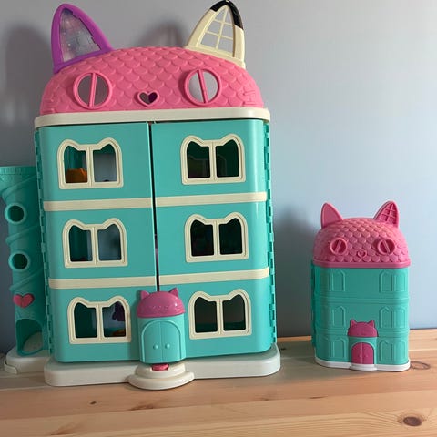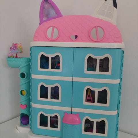 Gabby dollhouse lekehus. Mangler bunn. Tross dette blir det lekt flittig med og er til stor glede. Må bare ha bøker på sidene for å støtte dørene, men disse blir også brukt som ekstra rom og trapper🤭