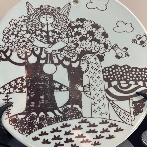 Buet glass som er håndmalt. 15 cm i diameter. Finnes nok bare en av denne.
