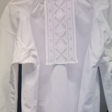 Skjorten er sydd i bomull, med tradisjonell Hardanger-broderi brodert på lin.