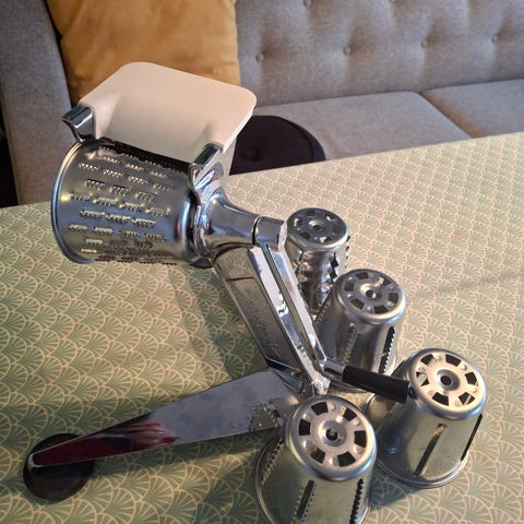 Food prosessoren er lett å sette sammen og lett og bruke Ekstra effektivt når man skal lage mat til mange / selskap. Prosessoren hakker, skreller, strimler , bølger , river og skiver - den har 5 « tromler» som man velger mellom .