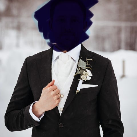 Dressbuksen har et hull like under smekken som ble sydd sammen i hurten og sturten mellom bryllupsmiddagen og kaffeservering. Dette vil fikses før salg. Ønsker du derimot å gjøre det selv, kan du få buksa til halv pris, altså 1000 kr avslag.