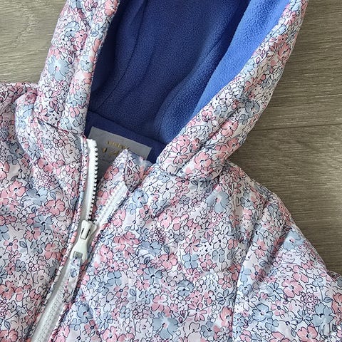 Name it jakke for jenter i størrelse 98. Jakken er rosa med et fargerikt mønster, laget av polyester. Praktisk for hverdagsbruk. Noe slitasje nede på ermene, og misfarging på foret innvendig. Se bilder. Anorakkdesign med lomme på magen.