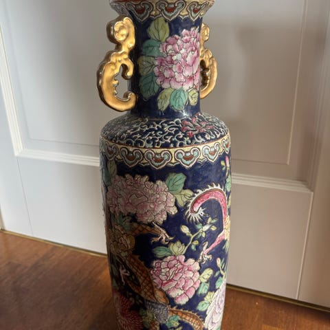 Selger to fine vintage kinesiske blomsterpotter, som er nesten identiske. Dekoren med fugler og peoner i fargerik palett minner sterkt om famille rose (fencai)-stilen, som ble svært populær i Qing-dynastiet, særlig på 1700–1800-tallet.