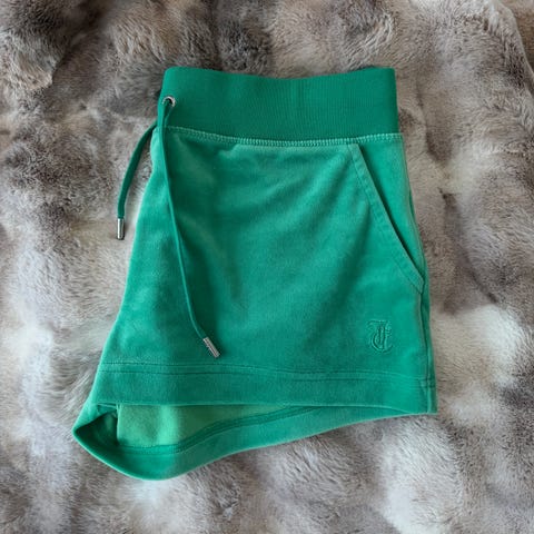 Juicy Couture shorts i størrelse 34 for dame. Fargen er blå, og materialet er mykt og komfortabelt. Passer godt til uformelle anledninger og avslappet bruk.