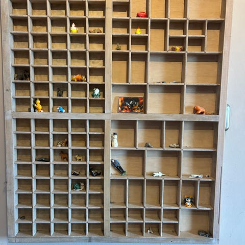 Veldig pen settekasse i mørkt treverk med lysegrønn/turkis bakgrunn