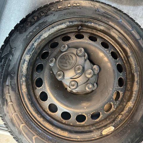 Brukte dekk på stålfelger. Stått på Caddy 2017 mod.