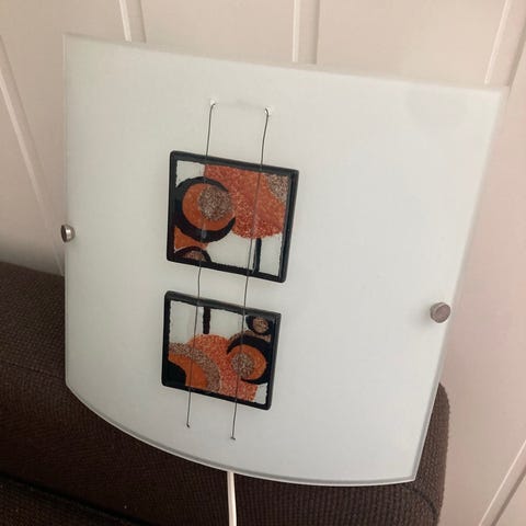 Selger en av mine vegglamper da jeg ikke har noen fin plass til den. Jeg har malt ledningen, men tror den er lett å bytte. Den ene glass skjermen er det gått av litt av glasset, (se bilde).