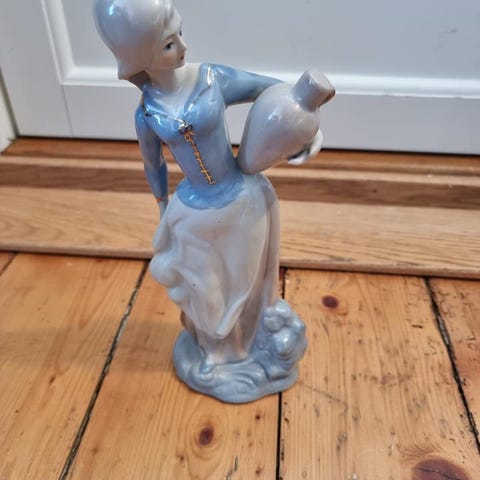 Lladrós porselensfigurer er kjent for sin høye kvalitet, utsøkte detaljer, myke farger og jevne finish. Alle figurer lages i det som er kjent som porselensbyen , Tavernes Blanques nær Valencia i Spania. Lampe med dame og hund fungerer som den skal. : Høyde 47 cm med skjerm kr. 500, Lesende gutt med sau og lam: Høyde 28 cm. Kr. 500,-Levering og sending kan avtales.