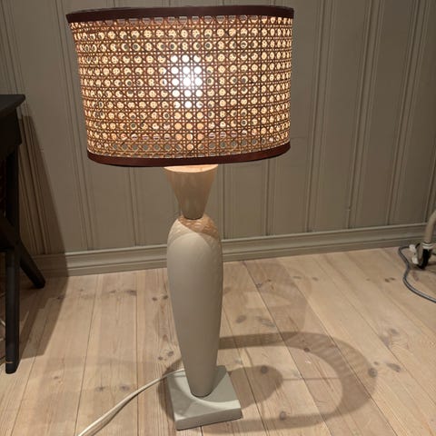 Skjermen som er på lampen er ikke original og passer egentlig ikke til den slik den er nå, derfor har jeg laget en provisorisk løsning med pappstøtte. Jeg har også den originale skjermen, men den har bruksmerker. Den kan medfølge gratis hvis ønskelig.
