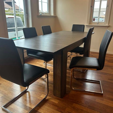 Det er seks stoler og to plater til å sette inn i bordet. Det er kjempetungt!