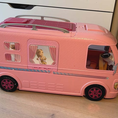 Selger denne Barbie campingbilen, som kan brukes på flere måter, med basseng og sklie, hengekøyer, seng, kjøkken, bad, bål mm. Se bilder. Den trenger en liten vask for å freshes opp, og er litt treg i mekanismen når man pakker den sammen - men det funker. Kostet 1490 kr ny.