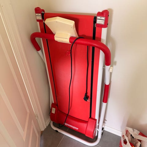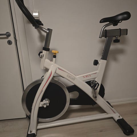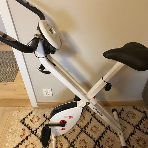 Sammenleggbar treningssykkel selges. Veldig lite brukt. Godt bredt sete, batteridrevet panel (AAA). Lett vekt og kan enkelt slås sammen og legges vekk når den ikke er i bruk. Pulsmåler i håndtaket, kjenner ikke til hvor riktig den er. Brett til telefonen under panelet.