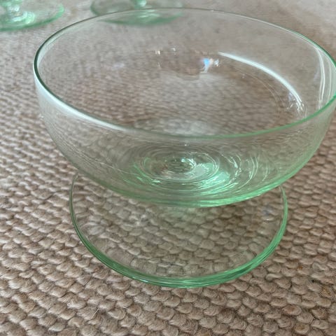 15 grønne Hadeland Krokan dessertskåler med hank. 10 med grønn hank, 5 med fargeløs hank. Pene og blanke. Kr. 120 pr. stk - ved kjøp av seks eller flere kr. 100 pr. stk.