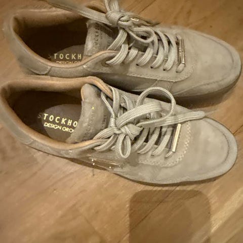 Stockholm Sneakers i størrelse 39. Disse joggeskoene kommer i en beige farge og er laget av semsket skinn. Perfekte for hverdagsbruk med en stilren design.