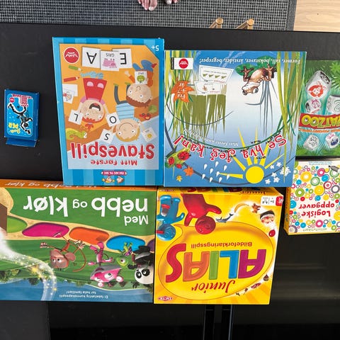 - "Spillet om Klatremus og de andre dyrene i Hakkebakkeskogen": Pent brukt, men mangler en spillebrikke (så det er 3 og ikke 4, men tror de fleste har en ekstra spillebrikke eller noe annet de kan bruke). Noen bruksmerker, men generelt fin tilstand. Kr 100