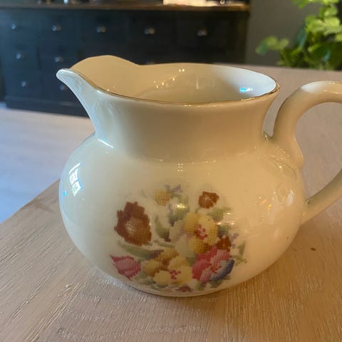 Mugge fra Egersund Fayance. Har et hakk i enden med håndtaket men er ellers i fulkt brukbar stand. Sendes mot forskudd og frakt.