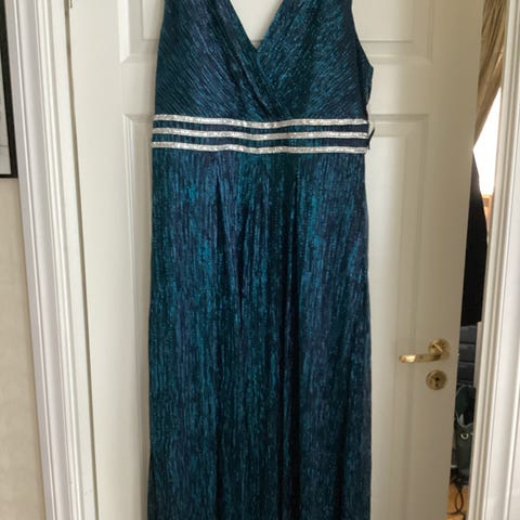 Nydelig sort og sølv lang selskaps/ball-kjole, size 16 (ca str 42). Åpen rygg og halter-neck . Faller flott og "tungt". Nypris 4000. Selges meget rimelig.
