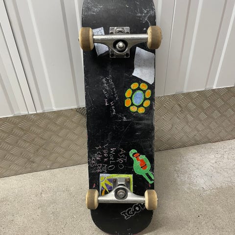 Selger et Tony Hawk trikseskateboard. Brettet er godt brukt, men fortsatt fullt brukbart for den som vil ha et billig skateboard til triksing, cruising eller som nybegynnerbrett.