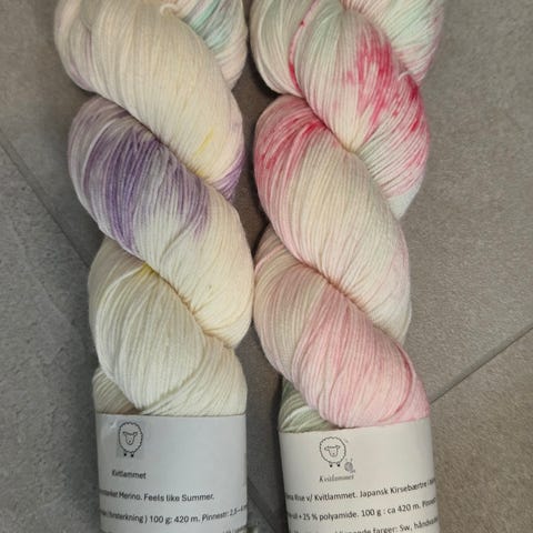 To hesper fra Millas mikrofargeri 100% merino superwash. Hver hespe veier 100g og har en lengde på 225 meter. Garnet kommer i fargene rosa "engelsk rose" og grå "dompap".