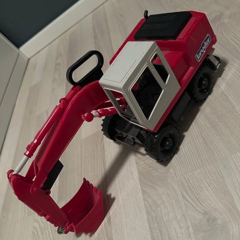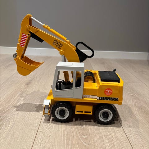 Virkelighetstro gravemaskin. Knapt brukt, hel og fin. Skuffen kan løftes og plasseres i flere vinkler. Hele huset på gravemaskinen kan roteres.