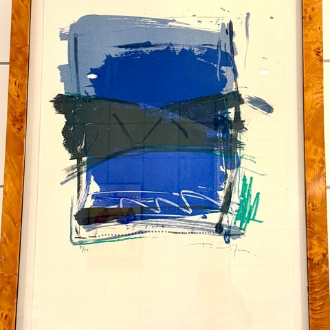 Litografiet jeg selger av kunstneren danner til sammen det som kalles et triptykon (tredelt bilde). Bildet er holdt i blått, brunt og sort og er farger som går igjen i mange av kunstnerens malerier.