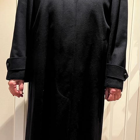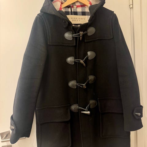 Vintage koksgrå/svart duffelcoat i ull fra 70 tallet. Innvendig rutet blått/svart ullstoff. Pent brukt. Alle knapper og snorer i orden. Str. 38/40. Det er ingen merkelapper i den.