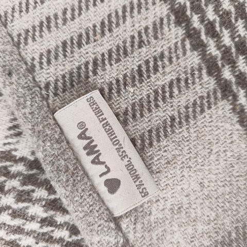 Selger et flott Lama Lambswool-ullpledd, tofarget i lys og mørk grå.