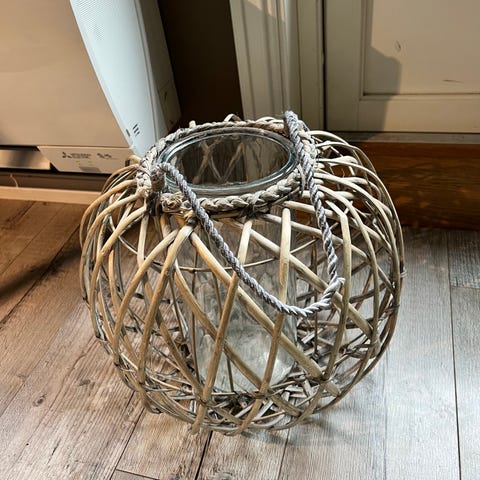 Flettet lyslykt med grå flettet kurv og glassinnsats. Passer til bruk med telys eller små stearinlys. Ideell for å skape en koselig atmosfære i hjemmet eller på terrassen. Kurven har et rustikt utseende som gir en naturlig sjarm til innredningen.