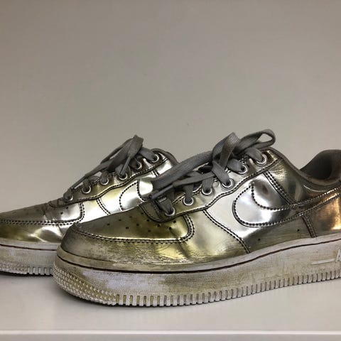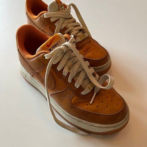 Nike Air Force 1 sko i rosa farge for dame. Størrelsen er 37.5. Den har noen synlige bruksmerker, og fargen er litt slitt, men ellers fin:) Nypris: 1500kr