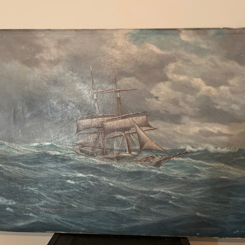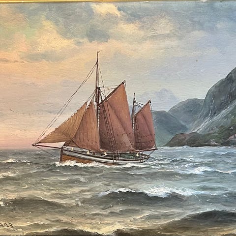 Oljemaleri av Martin Aagaard "Skute med losbåt"