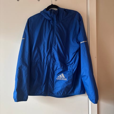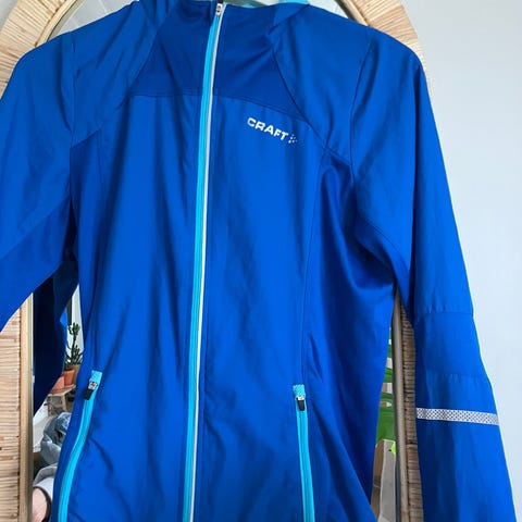 Only Play Sports Wear jakke i størrelse Medium. Jakken er egentlig str M, men liten str. Jeg vil si str S-M. Jakken er korallrød og designet for løping. Den har svarte detaljer ved albuene og reflekterende elementer for økt synlighet. Den har lomme med glidelås bak på ryggen. Den gir god bevegelsesfrihet.