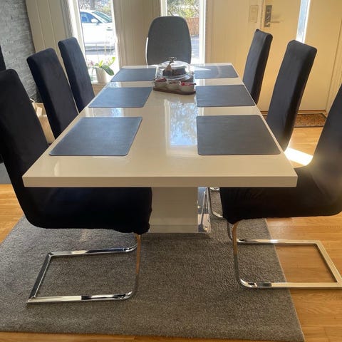 Spisebord selges. Bordet har med ekstra ileggsplate så det kan bli 230 langt. Bordplaten er noe slitt og det bør polereser, det er et merke som vises på bilde. Det er ellers helt og greit.