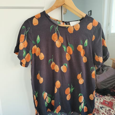 Blusen har rund hals med åpning bak, en knapp, 3/4 lange ermer, strikk i livet og ryss kant nederst på blusen.