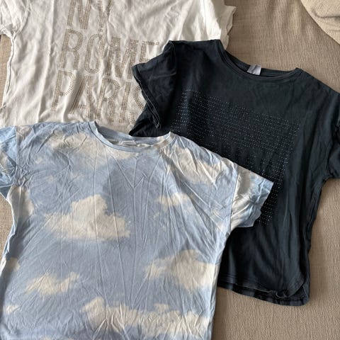 Selger pakke med t skjorter i størrelse 134/140 og en skjorte i størrelse 134. Plaggene var lite brukt