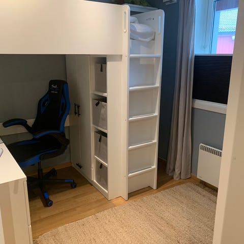 IKEA Loftseng barnemøbel i hvit. Denne sengen er designet for å gi ekstra gulvplass ved å heve soveområdet. Den har en robust stige for enkel tilgang til sengen, og en plassbesparende design som inkluderer plass til skrivebord eller oppbevaring under. Perfekt for barnerom med begrenset plass.