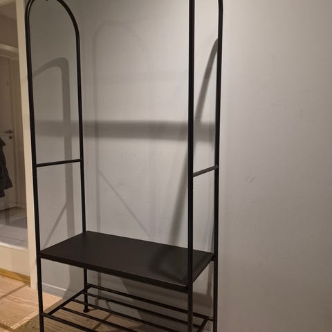 Pent brukt garderobestativ med hjul og hylle til sko eller annen oppbevaring.