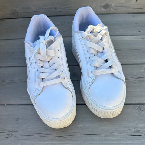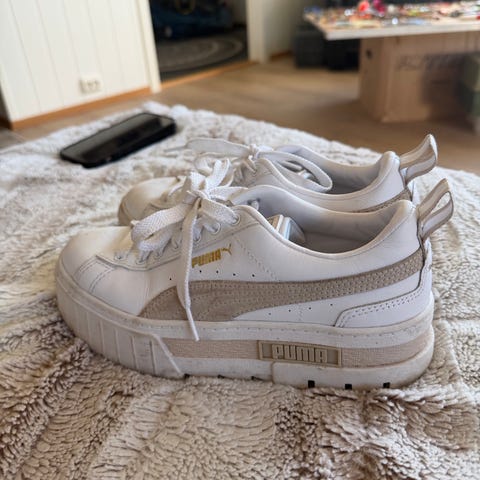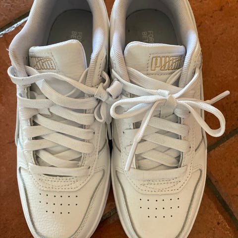 Hvite puma sko i str.38. Trenger en solid vask. Er lite brukt, bare blitt litt flekkete som bildene viser.