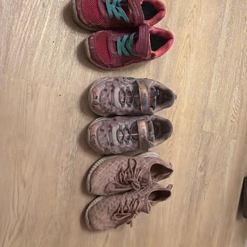 Disse var favoritter hos barnet mitt. Brukt i 2 sesonger, veldig slitne og har mye slitasje (se bilder), men kanskje kan fortsatt brukes som reservesko? Blinker bittelitt igjen, men ikke så synlig lenger.