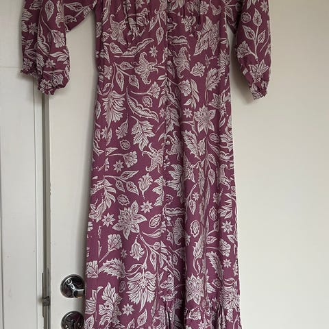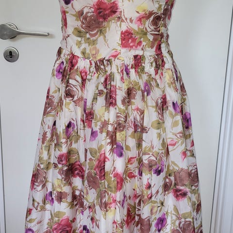 Meget pen ekte vintage-kjole. Trolig 70-tallet. Merke Kaisa Heikkila. Innsvinget. Foret. Glidelås bak. Størrelse 36. Polyester. Påsydd stoffbelte knytes i korsryggen for perfekt passform. Lengde fra overkant skulder til skjørtekant ca 107 cm. Omkrets under armene ca 85 cm, liv ca 75 cm. Billigste porto. Se også mine øvrige annonser.