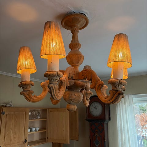 Solid lysekrone, 35 år gammel. Tofarget, hvitt metall og messing, men noe anløpt nå.